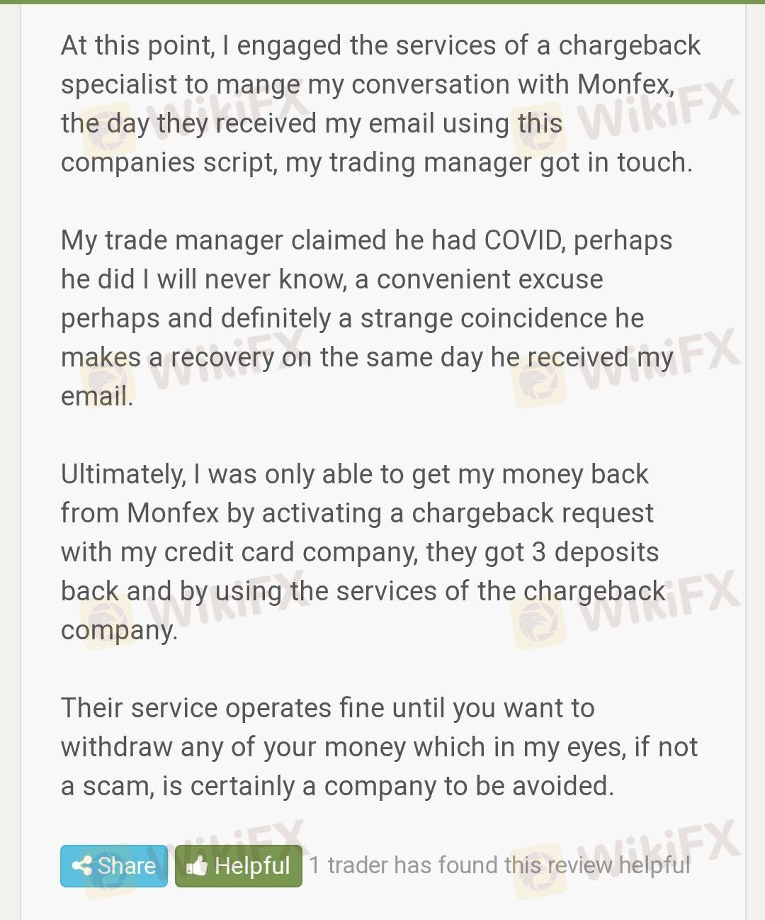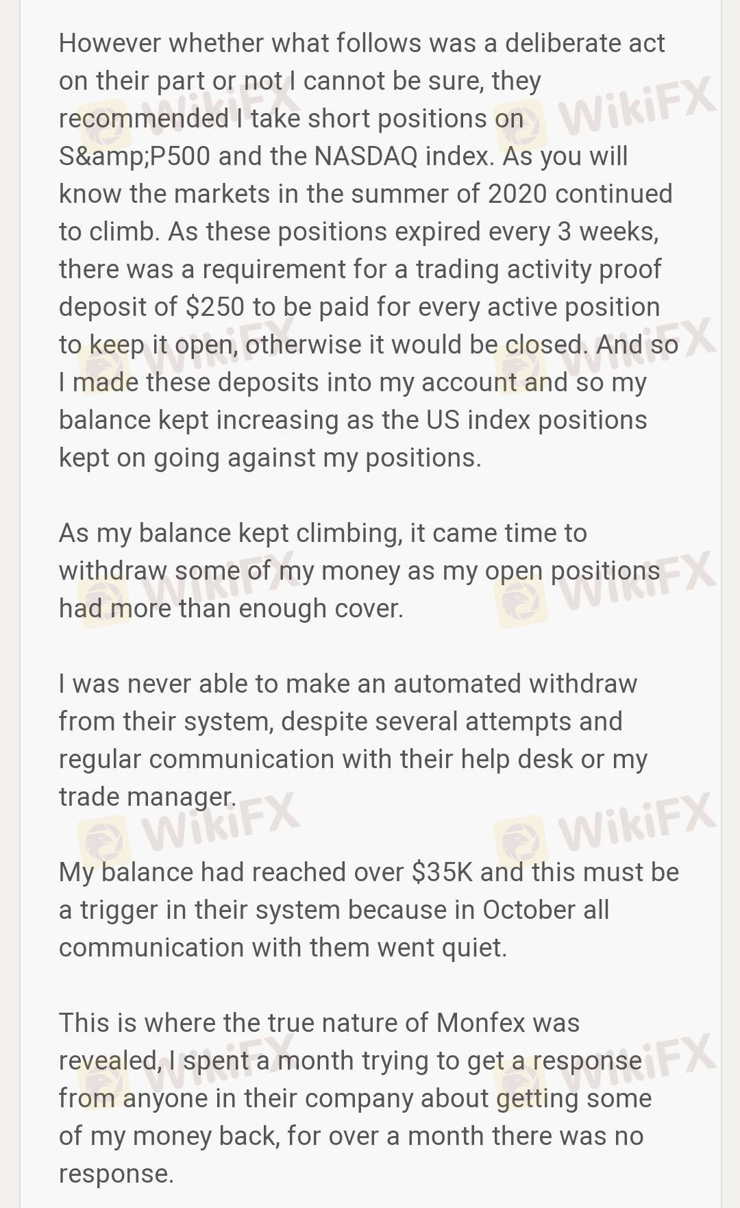 A client has complained about his terrible experience while trading with Monfex that he ha d a really hard time in withdrawing his deposits as it took months and lots of hassles. He claims Monfex works fine until a client wants to withdraw.